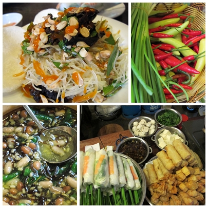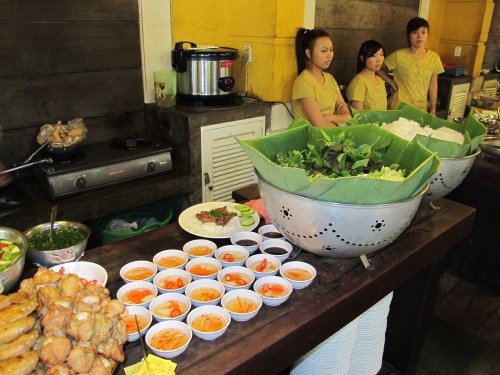 Now going back to the menu in this place, we were pleasantly surprised to find that the prices are in fact very reasonable for a place oozing with local ambience, food so fresh and resto crew smiling 24/7. Nha Hang Ngon (“ngon” means delicious) has a quaint architecture and the periphery of the building is lined with foodstuff from appetizers to soups to mint-flavored dishes, to various barbecued meats and vietnamese rolls to desserts. It was a chore to choose from among the foods on display. Our version of “turo-turo” (point – point) where a diner does the mandatory circling of all food stalls and orders which ones should be served on their table.