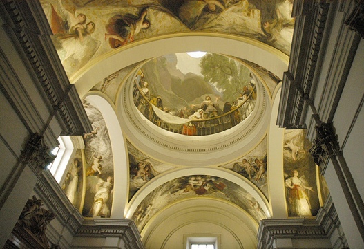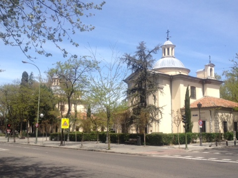 The metro stop says Principe Pio. Walking right from the station along Paseo de Florida for some 10 minutes, the statue of Goya proudly stands in the glorietta fronting the Ermita de San Antonio de la Florida. I thought I was seeing double when I reached the place, only to learn that a sister church with twin features was built right next to the original which has since been turned into a Museum. The mortal remains of Goya lie in the original 18th century Neo-classical church, while worship was transferred to the adjacent sister church. Both churches are tiny, with floors shaped like a Greek cross.