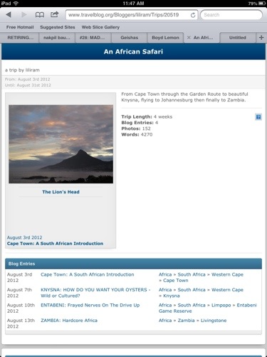 And me? I’ve had my fill of adventures this 2012 just as my 2 blogsites each hit 100,000 views. Early in the year, I left and lived in Spain for nearly 3 months where I helped set up house for a niece. Back in Manila in May, in time to enjoy the last few weeks of Manila summer with the rest of family. Before long, I was off to a dream trip in August. Another one off my bucket list. South Africa and Zambia. All adventures fully documented, to include some domestic destinations which were shelved for the longest time.
