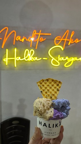 This land tour is so worth it, even if it’s more expensive than the island-hopping tour and more so than doing it on your own with rented scooters. We enjoyed all the stops especially the Sugba Lagoon boat ride and visit. Lunch could have been served better in the area of the Magpupungko Rock Pools where there are beachfront eateries, and errrr more interesting desserts like the buko halo halo. But we’re good. We got good value for the P2,100 we paid for each person. By the time we were driven back to our hotel, we just dropped our bags and went in search of desserts. These deprived ladies found one near the church. Homemade ice cream, halo halo and maiz con hielo. But nearer our hotel, another shop prides itself for its artisanal gelato. So there. 😋😘🥰