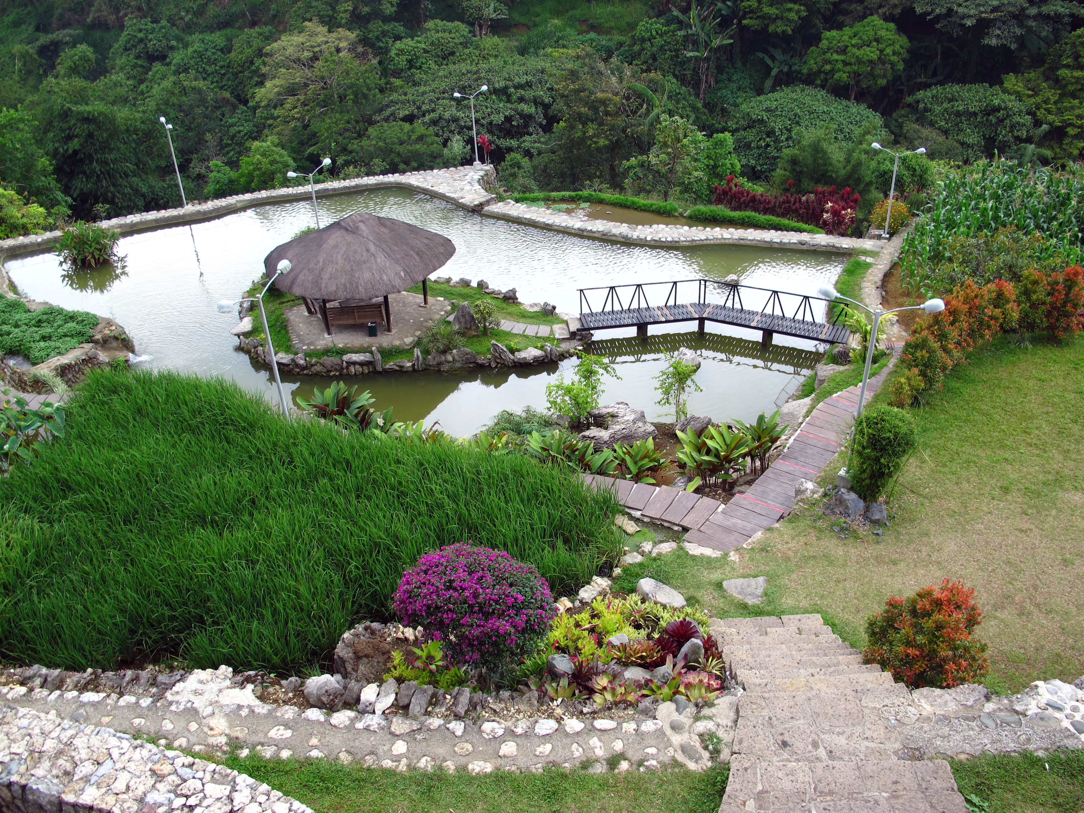 We came , knowing we won’t get disappointed with this National Artist’s works and art collections. Learning more about the indigenous art in this neck of the woods comes as a bonus . Appreciating how BenCab’s art evolved through the years since he dropped out of college to emerge as a Master of Contemporary Art is a natural consequence. Beyond all these, we were still surprised to find that behind the Museum is a farm and garden where one can arrange an eco-trail tour to meander around duck ponds, a forest, a layered garden imitating the famous rice terraces, typical indigenous architecture of the Ifugao, Kalinga and Bontoc. We wandered around the pond, crossed a charming wooden bridge leading to a small kiosk overlooking a mini forest and a river meandering through the property along with a cascading waterfalls on one end of the property.