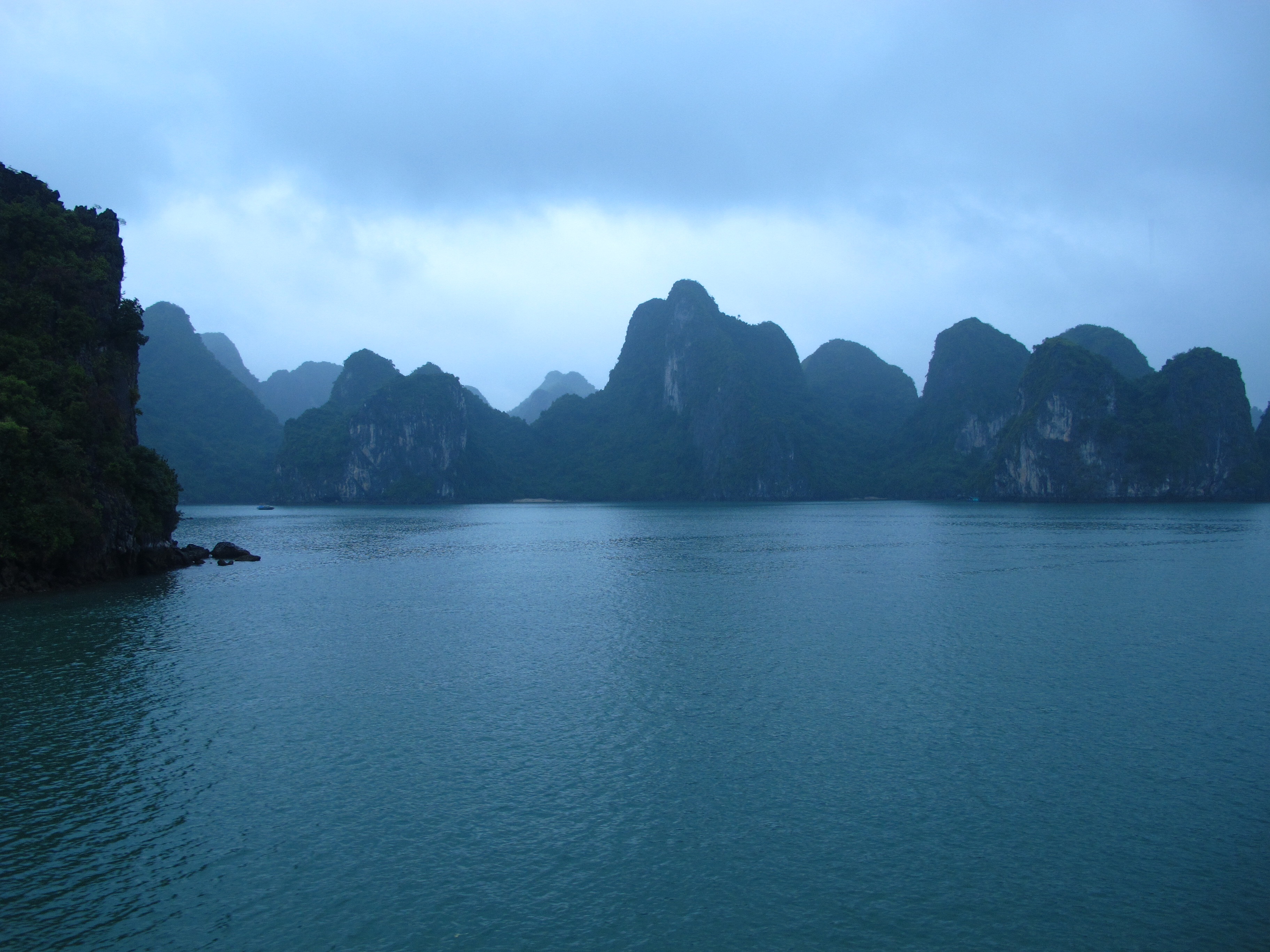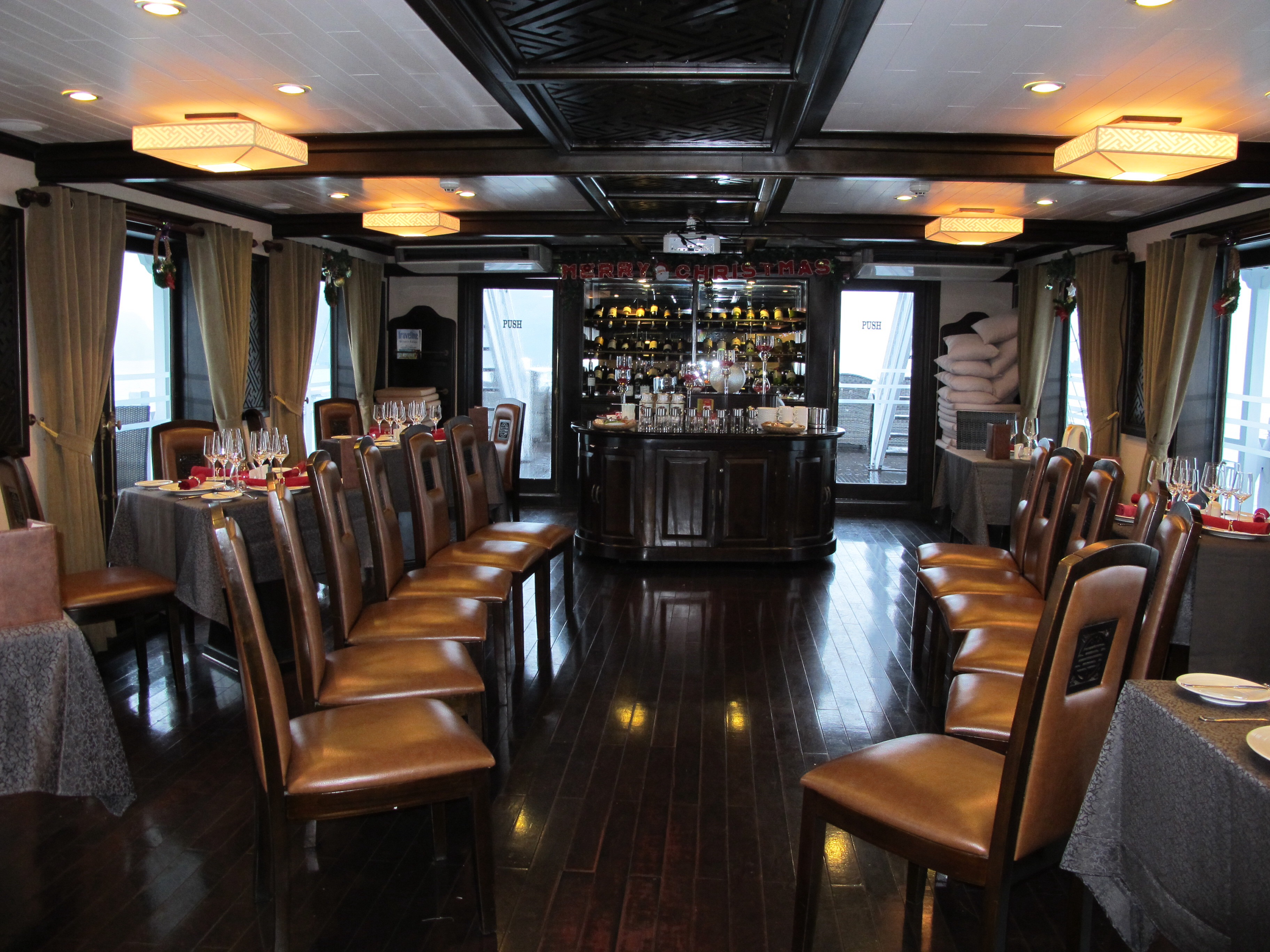 The barista and culinary lessons were held in the dining hall. The tai-chi too, because the sundeck was wet from all the rain. The heavens wept while we slept, and just as we were sailing back to shore. The only thing is dining is intermittently interrupted as we passed the karst formations viewed from the glass windows and doors spilling out to balconies. How can you not help taking a photo? Lovely day. Soothing nights. We even passed one rock formation with a cave all lighted up for a private candlelit dinner!